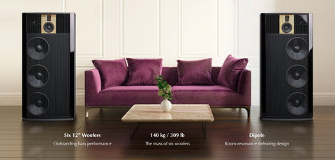 This full range loudspeaker is designed for creating the holographic stereo reproduction of the Steinway & Sons Model D speakers through use of the dipole speaker concept – all in a smaller package. The Steinway & Sons Model B not only looks powerful with its impressive line-up of drivers, but together with the digital crossover and true quad-amplification of the 4 x 400-watt digital amplifier, Steinway & Sons Model A2, the resulting sound reproduction is nothing short of stunning. Extraordinary performance. A dipole speaker requires a large front area to separate the front and rear radiation of low frequency sound. In the Model B, the sides are elegantly folded back to add to the acoustic width of the speaker. Furthermore, the six pieces of woofer add up to an extremely large radiating surface capable of producing a linear output down to 25 Hz.