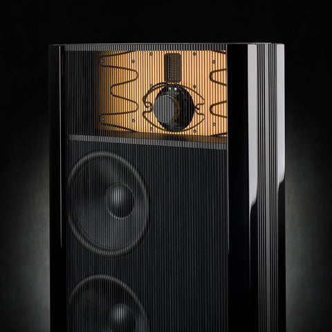 This full range loudspeaker is designed for creating the holographic stereo reproduction of the Steinway & Sons Model D speakers through use of the dipole speaker concept – all in a smaller package. The Steinway & Sons Model B not only looks powerful with its impressive line-up of drivers, but together with the digital crossover and true quad-amplification of the 4 x 400-watt digital amplifier, Steinway & Sons Model A2, the resulting sound reproduction is nothing short of stunning. Extraordinary performance. A dipole speaker requires a large front area to separate the front and rear radiation of low frequency sound. In the Model B, the sides are elegantly folded back to add to the acoustic width of the speaker. Furthermore, the six pieces of woofer add up to an extremely large radiating surface capable of producing a linear output down to 25 Hz.