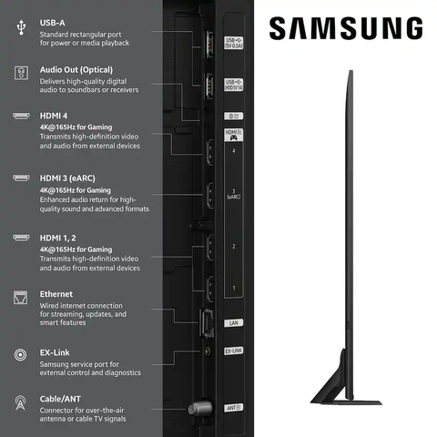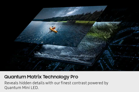 Samsung's brightest glare-free 4K TV, perfect for sun-filled rooms! The great 4K AI processor powers Samsung Vision AI for enhanced picture, sound, and breakthrough TV experiences. Quantum Matrix Mini LEDs unlock bright detail on a glare-free screen, for distraction-free viewing in the bright rooms. Top speakers provide multi-dimensional AI-enhanced sound that tracks to on-screen motion.