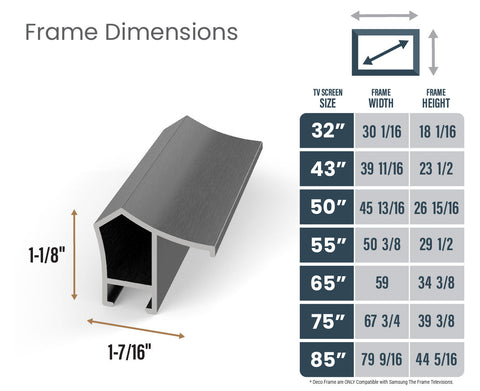 Deco TV Frames are the finishing touch your space needs. Bring your look together with an Alloy Bezel for a more contemporary feel. With each frame made of true aluminum, the metallic finish beautifully reflects the light into your room. The frame ships directly to you in four easy-to-assemble pieces and can be snapped together and fully attached to your Samsung TV in under 2 minutes. Each frame hooks onto the top of your Samsung Frame television and clips into place at the bottom to perfectly align with the edge of the TV screen. All frames can be easily installed by any consumer with no technical knowledge.