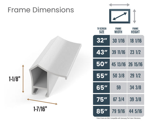 Deco TV Frames are the finishing touch your space needs. Bring your look together with an Alloy Bezel for a more contemporary feel. With each frame made of true aluminum, the metallic finish beautifully reflects the light into your room. The frame ships directly to you in four easy-to-assemble pieces and can be snapped together and fully attached to your Samsung TV in under 2 minutes. Each frame hooks onto the top of your Samsung Frame television and clips into place at the bottom to perfectly align with the edge of the TV screen. All frames can be easily installed by any consumer with no technical knowledge.