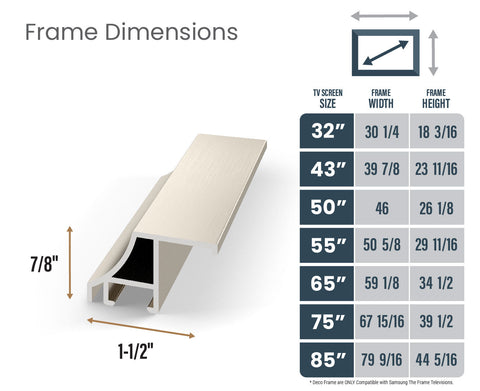 Deco TV Frames are the finishing touch your space needs. Bring your look together with an Alloy Bezel for a more contemporary feel. With each frame made of true aluminum, the metallic finish beautifully reflects the light into your room. The frame ships directly to you in four easy-to-assemble pieces and can be snapped together and fully attached to your Samsung TV in under 2 minutes. Each frame hooks onto the top of your Samsung Frame television and clips into place at the bottom to perfectly align with the edge of the TV screen. All frames can be easily installed by any consumer with no technical knowledge.