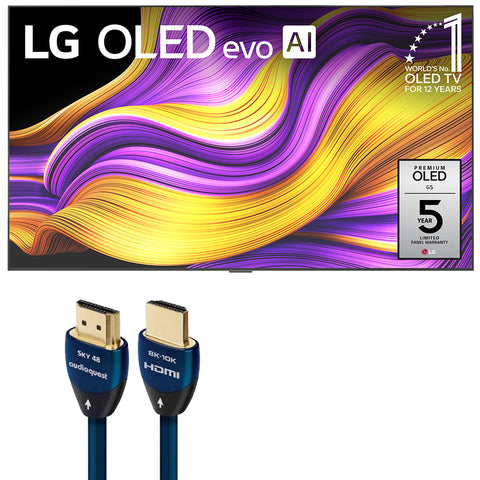 Transform your space into a world-class cinema with the LG 77” OLED evo G5 TV paired with the premium AudioQuest Sky 48 HDMI cable. Enjoy stunning 4K OLED picture with Brightness Booster Max and Dolby Vision, immersive Dolby Atmos sound, and ultra-smooth gaming up to 120Hz. The included 48Gbps HDMI cable ensures flawless audio and video transmission—even for the most demanding content—making this bundle the perfect fusion of breathtaking visuals and high-performance connectivity.