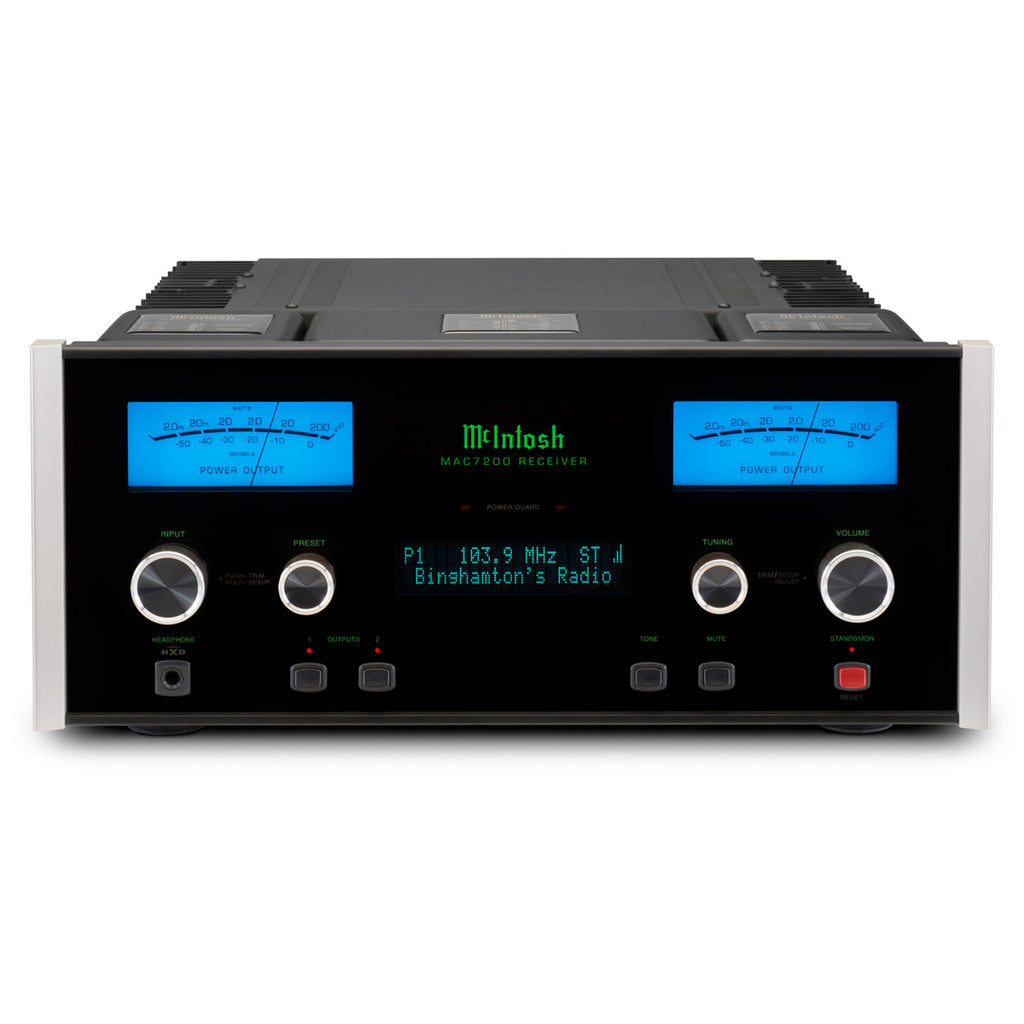 The McIntosh MAC7200 is a high-performance stereo receiver that combines powerful sound with classic design. Delivering 200 watts per channel, this receiver features 14 inputs (analog and digital) for seamless integration with all your audio equipment, including turntables, SACD/CD players, and digital sources. Its legendary AM/FM tuner offers unparalleled clarity and precision, with advanced features like RDS support, signal quality monitoring, and 20 presets for each radio band. The DA1 Digital Audio Module includes a 32-bit DAC for superior sound and supports high-resolution audio up to DSD256 and DXD 384kHz. Iconic McIntosh Monogrammed Heatsinks™ ensure efficient cooling, while technologies like Autoformers, Power Guard®, and a high-drive headphone amplifier enhance every listening experience. Wrapped in McIntosh’s signature black glass front panel with illuminated blue watt meters and gold-plated speaker binding posts, the MAC7200 is not just a receiver—it’s a statement of audiophile excellence.