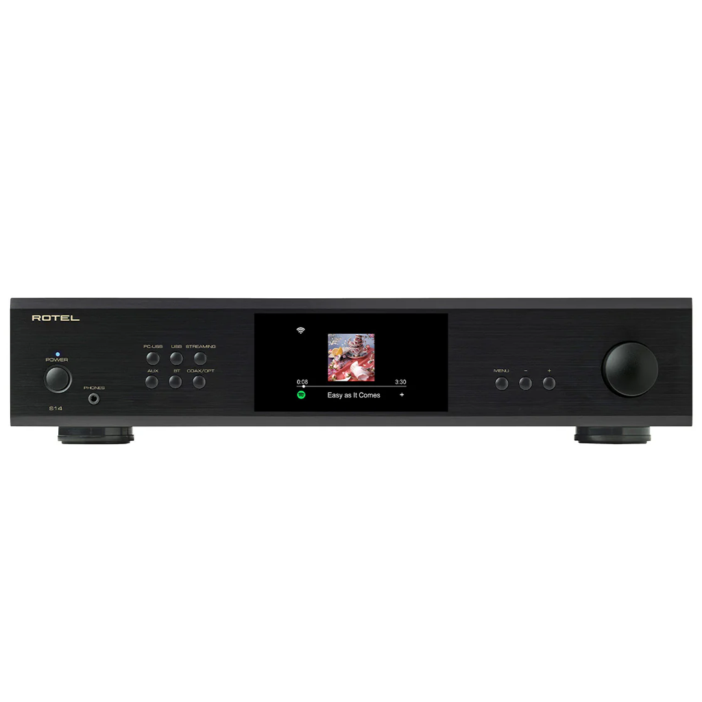 The Rotel S14 Integrated Network Streamer is an all-in-one solution providing convenient, intuitive access to the near limitless catalog of online music. High resolution audio including MQA from Tidal and Qobuz is rendered with detailed precision through a 32-bit ESS DAC delivering 150 Watts of Class AB power into 4 ohms.